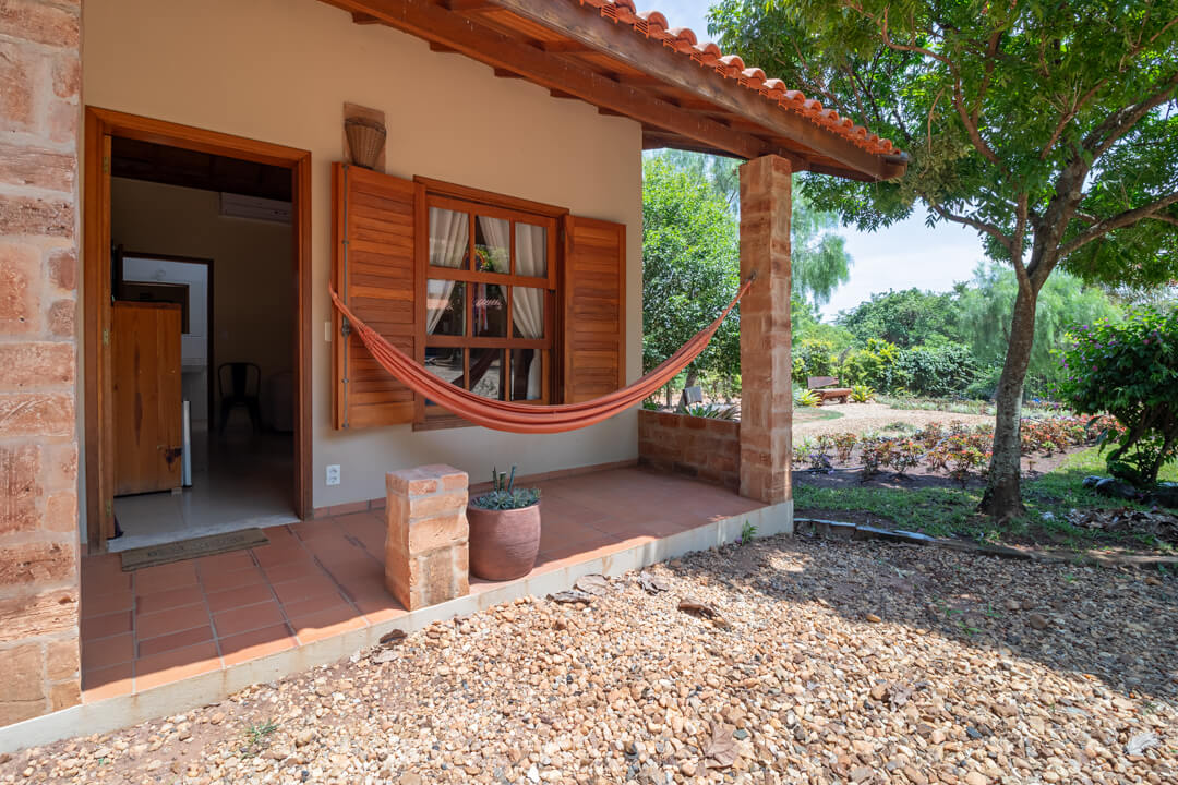 Suítes amplas que se assemelham de chalés com varanda e rede, em frente a um lindo bosque — perfeita para relaxar e com capacidade para até 4 pessoas.